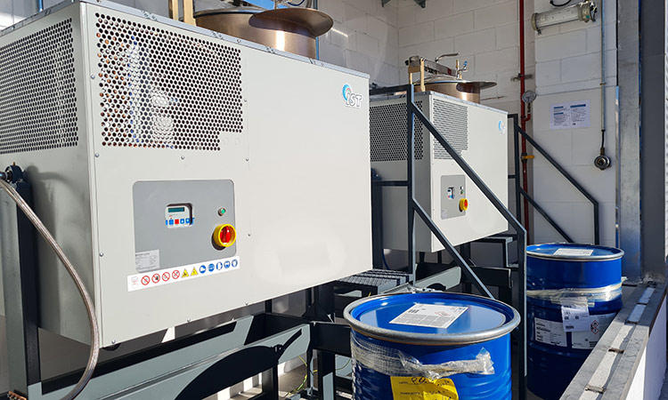 Sistema de recuperación por “batch” compuesto por 2 equipos de 200 litros. El proceso se realiza al vacío e incluye fases de purga, decantación, filtrado y contabilización. Todos los equipos eléctricos son ATEX. Los trasvases de disolvente sucio y recuperado se realizan mediante bombeo neumático.