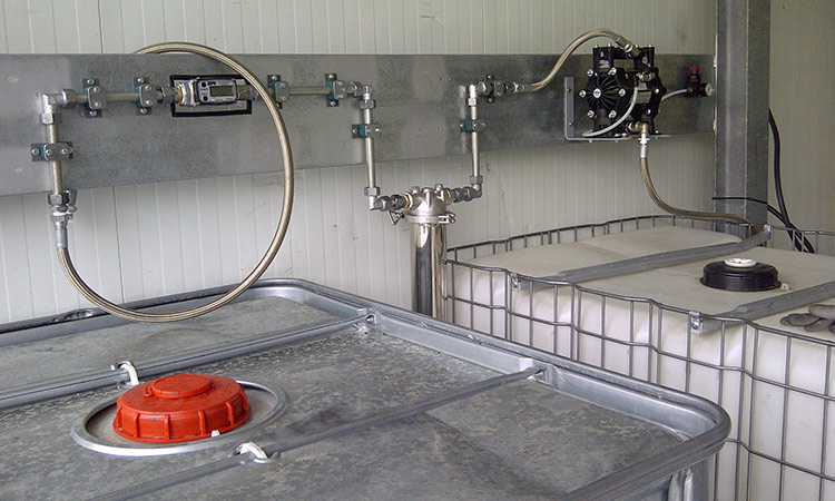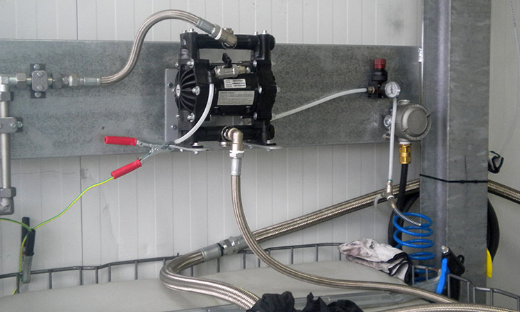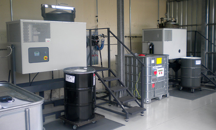 Sistema de recuperación por “batch” compuesto por 3 equipos de 200 litros. El proceso se realiza al vacío e incluye fases de purga, decantación, filtrado y contabilización. Todos los equipos eléctricos son ATEX. Los trasvases de disolvente sucio y recuperado se realizan mediante bombeo neumático.